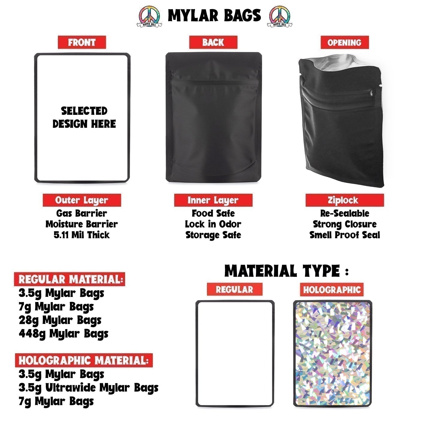 These Mylar zipper bags serve a variety of purposes for the needs of all dispensaries. For those who need a nice zipper pouch or bag in specific gram or ounce sizes, you would be able to select from a variety of baggie sizes to suit your specific needs.